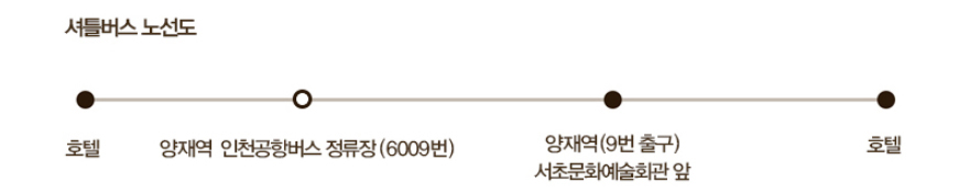 | 공항버스 | 6009번 [제 1 여객터미널]리무진 버스 이용 인천공항 1층 4A,4B 정류장 승차,양재역하차 →양재역 9번 출구 서초문화예술회관 앞 셔틀버스 승차 [제 2 여객터미널]리무진 버스 이용 인천공항 지하 1층 14, 15, 16 정류장 승차, 양재역 하차 → 양재역 9번 출구 서초문화예술회관 앞 셔틀버스 승차 공항방향 : [제1, 2여객 터미널] 01:00 ~ 20:30 호텔방향 : [제 2여객 터미널] 05:20 ~ 22:45 호텔방향 : [제 1여객 터미널] 05:40 ~ 23:06 |