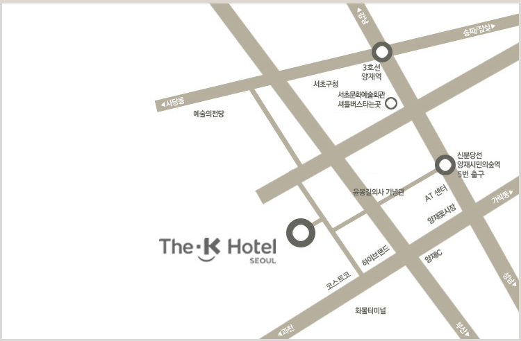 | 지하철 이용시 | 도보 : 신분당선 양재시민의 숲(매헌)역 5번출구→도보로 5분정도 소요 셔틀벅스 : 3호선 양재역 9번 출구 서초문화예술회관 앞 →셔틀버스이용 마을버스 : 3호선 양재역 10번,11번 출구→서초08번,20번 마을버스이용 →호텔 후문하차 |